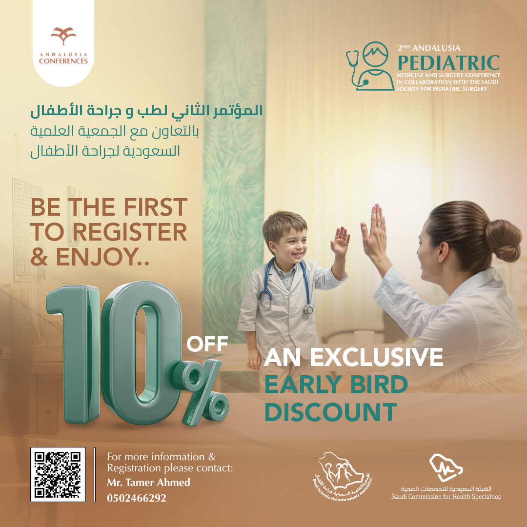 للتسجيل المبكر!سجل الآن لتتعلم كيفية تشخيص الحالات مثل مرض هيرشبرنغ، الجزر المعدي المريئي GERD، والتشوهات الخلقية، وتلقي الإحالات في الوقت المناسب، والعديد من المواضيع الأخرى التي ستكتشفها في المؤتمر الثاني لطب وجراحة الأطفال أندلسية. استمتع بخصم 10% عند التسجيل المبكر.